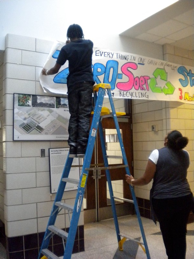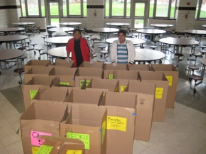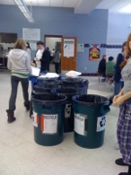 We made over 40 posters to announce the program in the school cafeteria and a cardboard bin for every classroom with permanent sign to signify the shift to zero-sort recycling and created a contest between the three school lunches promising a prize for the one that recycles the most. First lunch is currently in the lead.