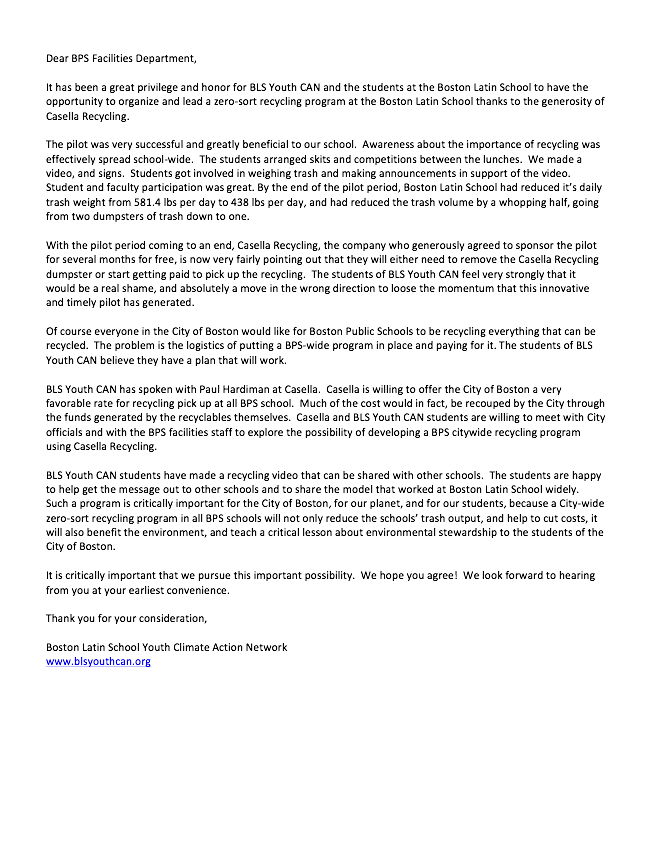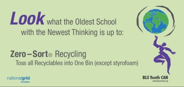 Thanks to all who made the 2010/2011 Zero-Sort Recycling Pilot at Boston Latin School a success. We cut our trash emissions in HALF! Special thanks to Casella Recycling for donating the pick up service for the entire year. The pilot was so successful the City of Boston is now developing a request for proposals to establish City-Wide Zero-Sort Recycling in all BPS schools by 2013.